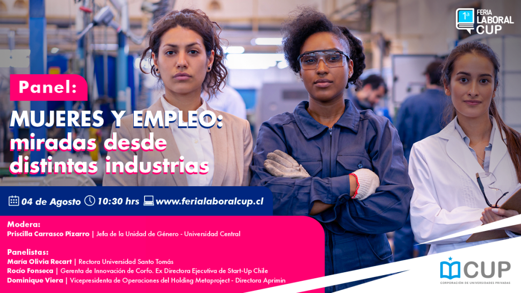 Para más información, e inscripciones, ingresa aquí: http://www.ferialaboralcup.cl/agenda/talleres-laborales/ver/panel-mujeres-y-empleo-miradas-desde-distintas-industrias/4623
