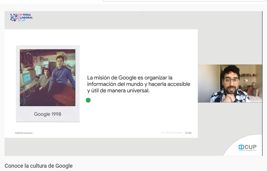 Con la presentación “Conoce la Cultura Google” a cargo del Especialista de Programas Universitarios de esta compañía, Juan Laverde, el jueves 5 de mayo la Corporación de Universidades Privadas (CUP) dio inicio al ciclo de conversaciones con empresas, previas a su Segunda Feria Laboral.