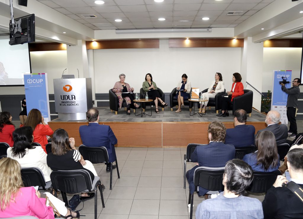 Acto seguido tuvo lugar el panel de conversación “Inteligencia Artificial: masculinidades, una invitación y reflexión necesaria”, liderado por cuatro rectoras de la CUP: Pilar Romaguera Gracia, de Universidad de Las Américas; Claudia Peirano Rodríguez, de la Universidad Santo Tomás; Marigen Hornkohl Venegas, de la Universidad Miguel de Cervantes; y Eva Flandes Aguilera, rectora de la Universidad SEK. El panel fue moderado por la jefa de la División de Educación Universitaria, María Elisa Zenteno.
